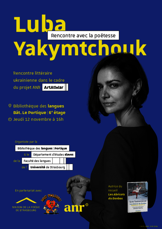 Luba Yakymtchouk, membre de l’Académie des écrivain·e·s sur les droits humains à l’Université de Strasbourg, sera de retour à Strasbourg dans le cadre du projet ANR ArtAtWar pour une rencontre littéraire le 12 novembre 2025.