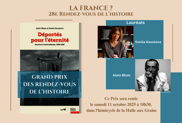 Alain Blum, démographe et historien (Cercec - EHESS/CNRS) et Emilia Koustova, historienne à la Faculté des langues de l'Université de Strasbourg, sont lauréats du Grand Prix des Rendez-vous de l'Histoire de Blois 2025 pour leur ouvrage Déportés pour l'éternité. Survivre à l'exil stalinien,…