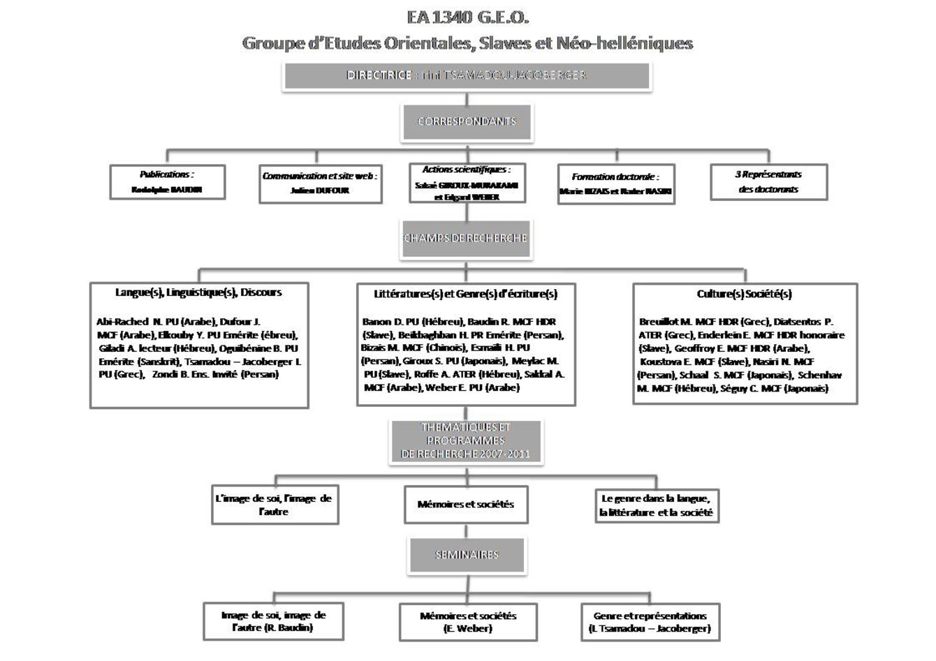 Les colloques et journées d'études (nationaux et internationaux) peuvent être organisés soit par une des composantes du GEO, soit en collaboration avec d'autres équipes, soit par l'ensemble des composantes lors de la synthèse finale du quadriennal
